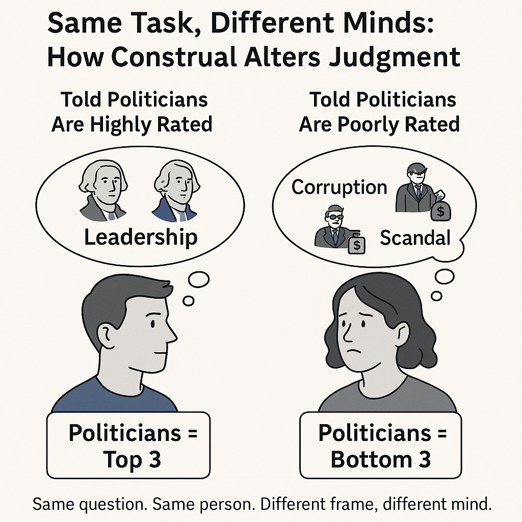 The groups who were informed that politicians were rated highly by previous groups brought to mind positive examples (Jefferson, Washington). Those told politicians were rated poorly imagined corrupt or cynical figures. The same term—“politician”—meant very different things depending on the prompt. That’s construal in action.